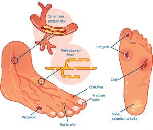 Periferna arterijska obliterativna-okluzivna bolezen se kaže kot motnja prekrvitve, ko stopalni pulzi niso več tipni in so arterijski pritiski na stopalih manjši kot 50 mmHg. Poslabšanje prekrvitve je povezano s pogostejšimi okužbami, slabšim celjenjem in večjo verjetnostjo amputacij[2].