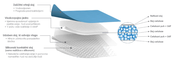 - Odlično zadrževanje bakterij, kar pripomore k učinkovitemu celjenju rane.
