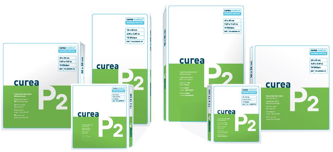 curea P2 je sterilna, super vpojna obloga za rane namenjena ranam v fazi granulacije z zmernim do obilnim izločanjem. Nelepljiv sloj obloge preprečuje vraščanje novonastalih celic v oblogo in zmanjšuje bolečino, ki se pojavi ob menjavi obloge.
