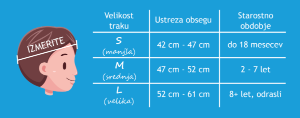 Velikosti traku so določene na povprečni velikosti obsega glave. V izogib izboru prevelikega traku, VEDNO izmerite obseg glave in preverite tabelo velikosti.