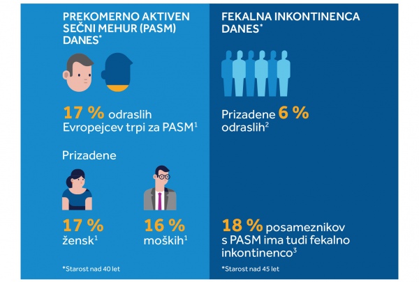 - s prekomerno aktivnim sečnim mehurjem (PASM), med drugim urgentno inkontinenco in pogostim mokrenjem