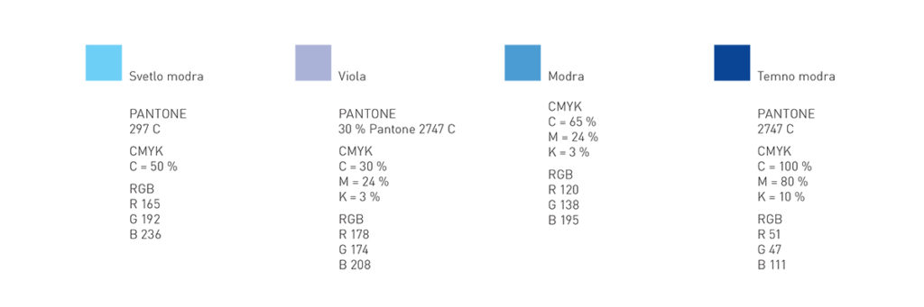 Primarni barvni sistem logotipa je zasnovan dvobarvno, kot modra in vijolična, s kombinatoriko obeh barv. Napis je zasnovan enobarvo, kot modra.