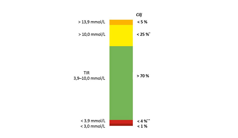 Smernice določajo, da je sladkorna bolezen tipa 1 in tipa 2 dobro urejena, če ima posameznik več kot 70 % časa (približno 17 ur na dan) vrednosti glukoze med 3,9 in 10,0 mmol/L.